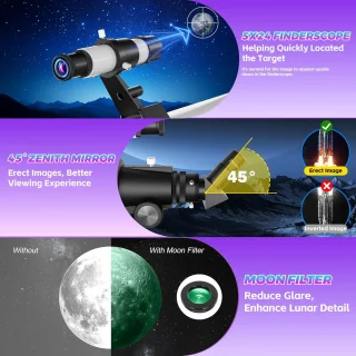 - Uitstekende optiek: 90 mm aperture voor heldere en gedetailleerde beelden; ideaal voor maan- en planeetobservaties.
