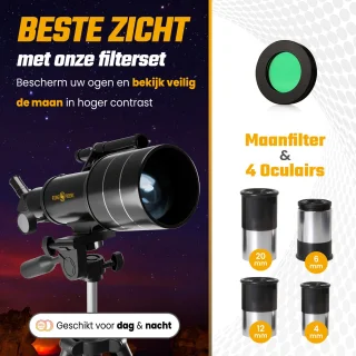 De 70 mm lens met FMC (multi-coating) zorgt voor helderdere en scherpere beelden. Het meegeleverde maanfilter vermindert fel maanlicht en verhoogt het contrast, waardoor kraters en oppervlaktestructuren veel duidelijker naar voren komen.