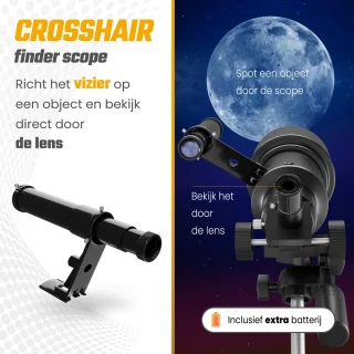 Het roestvrijstalen statief is volledig in hoogte verstelbaar, 360° draaibaar en 180° kantelbaar — zo positioneer je de telescoop altijd comfortabel. Het stabiele ontwerp met puntige poten staat stevig op verschillende ondergronden en de stevige draagtas maakt vervoeren eenvoudig. De telescoop is binnen enkele minuten opgebouwd waardoor je snel kunt beginnen met waarnemen.