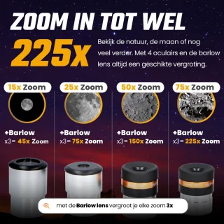 De telescoop wordt geleverd met vier hoogwaardige oculairs (4 mm, 6 mm, 12 mm en 20 mm). In combinatie met de meegeleverde 3x Barlow-lens en de brandpuntsafstand van 300 mm kun je tot 225x vergroten. Dankzij de combinatie van oculairs en Barlow heb je meerdere zoomopties, zodat je snel kunt schakelen tussen breedbeeldwaarnemingen en gedetailleerde close-ups.