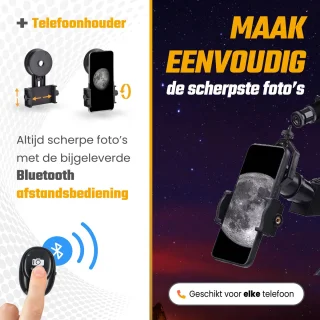 Leg je mooiste ontdekkingen vast met de meegeleverde smartphonehouder en Bluetooth afstandsbediening. Je smartphone plaats je eenvoudig in de houder; met de afstandsbediening maak je foto’s zonder de telescoop te bewegen, wat resulteert in scherpere beelden.