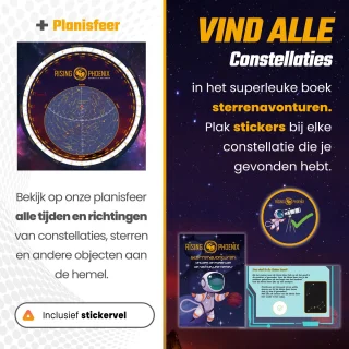 De set bevat een planisfeer en het leerboek "Sterren Vinden" met stickervel. Hiermee leer je snel sterrenbeelden herkennen, weet je wanneer welke sterren zichtbaar zijn en kun je jouw voortgang bijhouden door gevonden constellaties te markeren — leuk en leerzaam voor jong en oud.