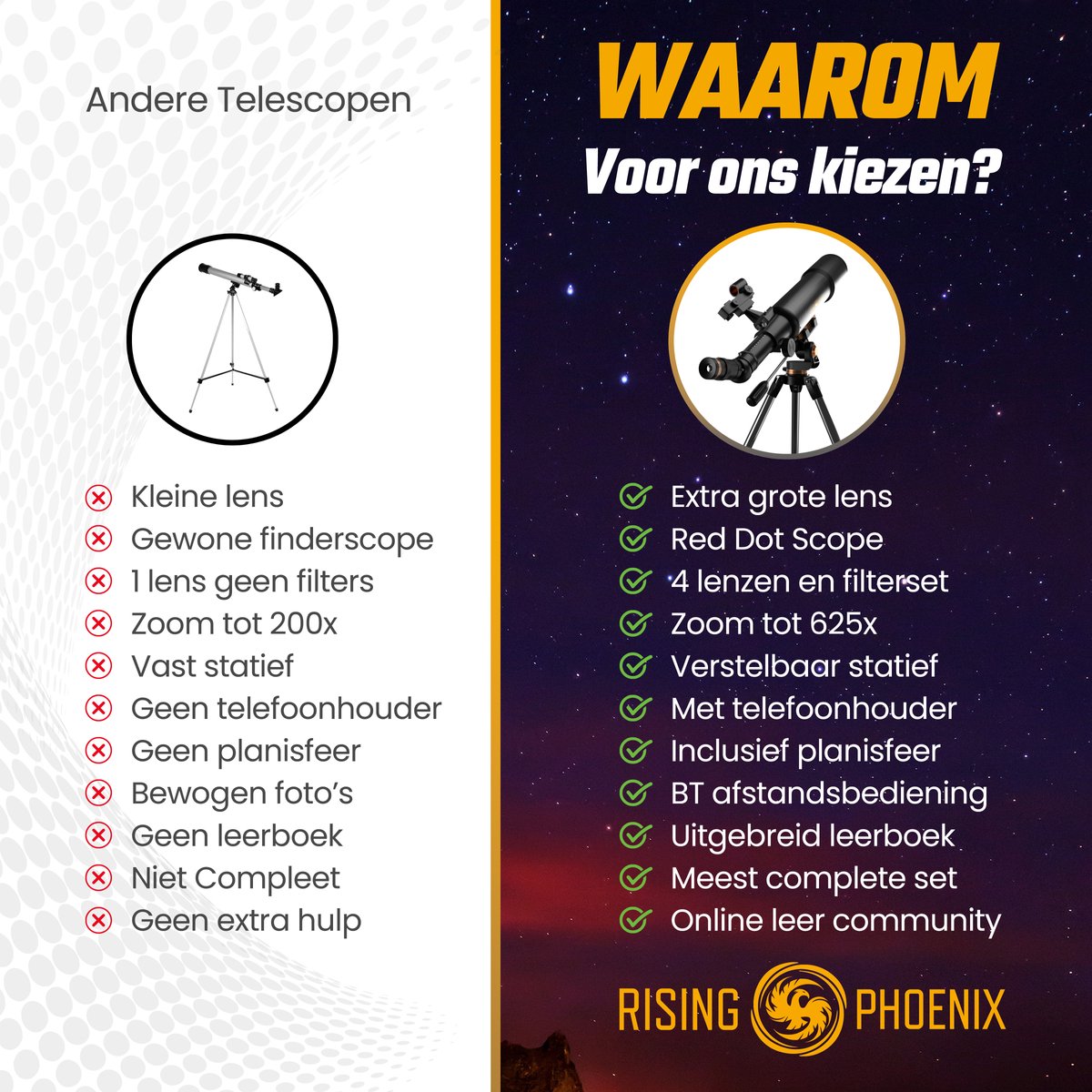Wacht niet langer! Bestel vandaag nog jouw Rising Phoenix sterrenkijker en ervaar de magie van de sterrenhemel zoals nooit tevoren. Ontdek planeten, sterrenbeelden en verborgen hemelverschijnselen – een avontuur dat je nooit meer zult vergeten!
