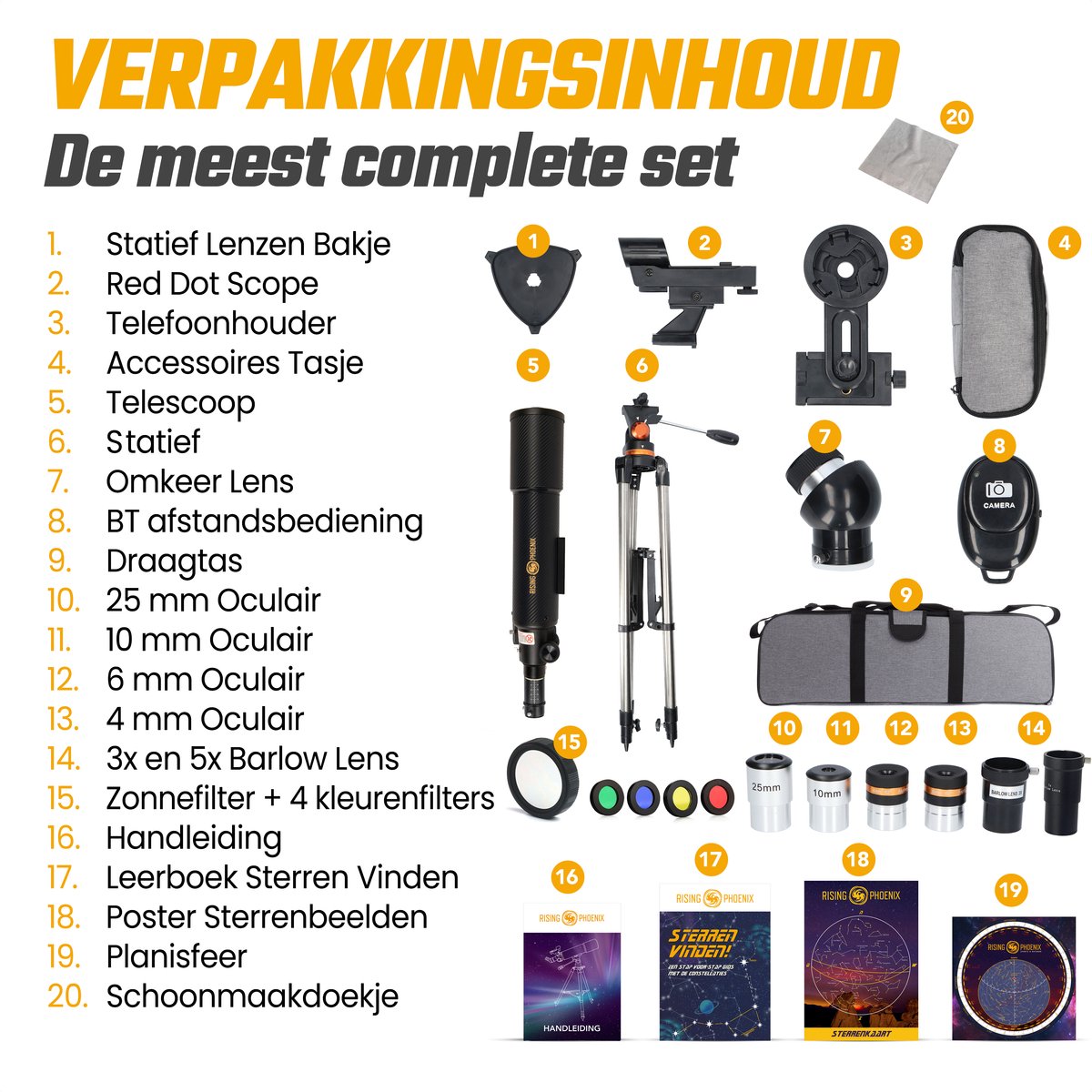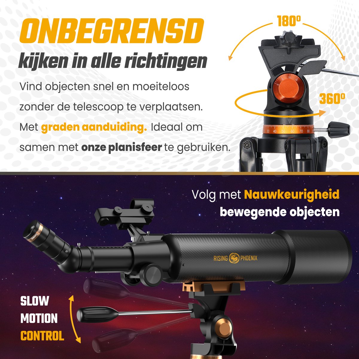 Ben je gefascineerd door de sterren en planeten? Wil je de schoonheid van de maan, de ringslierten van Saturnus en de Grote Rode Vlek op Jupiter van dichtbij bekijken? Met de robuste en veelzijdige Rising Phoenix Lenzentelescoop haal je een professionele sterrenkijker in huis waarmee je het heelal tot leven brengt. Dankzij de hoogwaardige optiek en geavanceerde functies ervaar je heldere, scherpe beelden en leg je indrukwekkende momenten vast alsof je een echte astronoom bent.