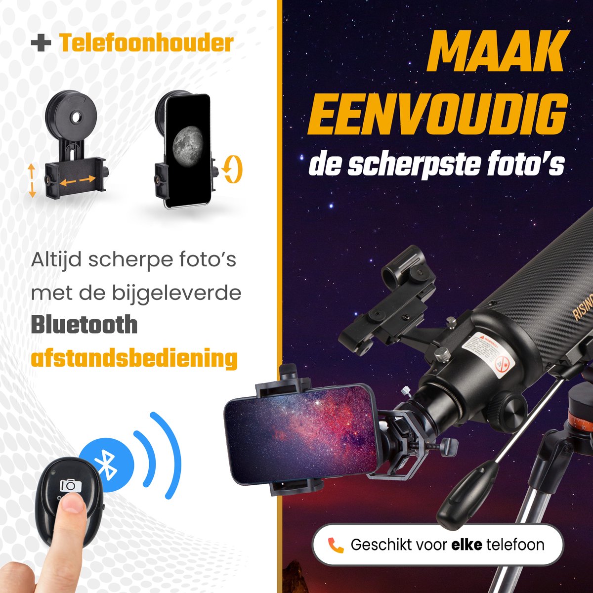 Leg jouw hemelgetuigenissen vast met de Bluetooth draadloze afstandsbediening en de bijgeleverde smartphone houder. Zo maak je haarscherpe foto’s zonder bewegingen, en kun je jouw beste momenten altijd koesteren en delen.